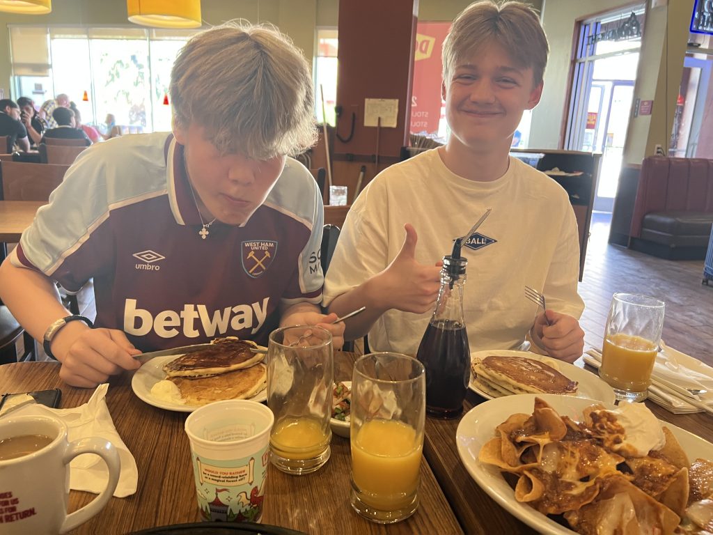 Vi blev enige om at vi skulle have et solidt morgenmåltid, og at vi gerne ville en tur på Denny’s (en amerikansk diner kæde vi tidligere har besøgt). Der var en 400 meter fra hotellet, så det var også nemt at komme hen til den. Til vores store overraskelse var der en mega lang kø til at få et bord. Vi valgte derfor at gå ned til en anden Denny’s hvor der var en god gåtur hen til. Der var heldigvis ingen kø til den nye Denny’s. Drengene fik pandekager og nachos til morgenmad. Klokken endte med at blive 11.00 før vi fik morgenmad.