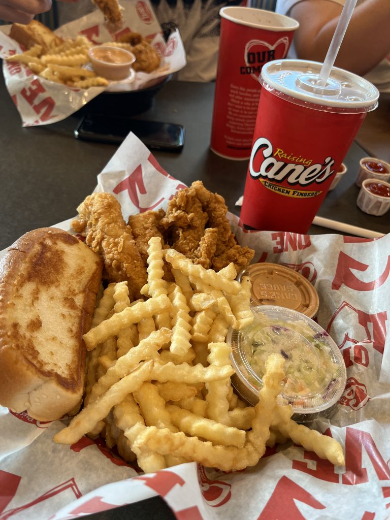 Til aftensmad fandt vi en Raising Cane’s. Villads har talt om den restaurant siden vores sidste tur til Los Angeles. Ved ikke helt hvorfor, men ønsket om et besøg har kun været stigende, især efter han fandt ud af at navnet stammer for ejerne tidligere hund!? Menuen er ret simple på Raising Cane’s. Man kan vælge mellem forskellige mængder af kyllingestykker eller en kyllingburger. Vi bestilte alle kyllingestykker. Maden var ok, men så heler ikke mere end det (undskyld Villads).