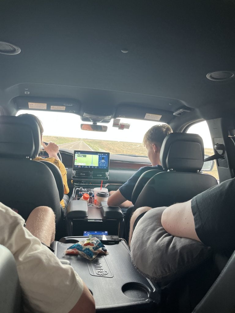 Nu var vi cirka halvvejs, og skulle have det sidste langt træk til hotellet der ligger ved Colorado Springs. Da jeg i dag har stoppet med at bruge min slynge, da det er to uger siden jeg fik den, så tænkte vi det også var tid til at drengene kunne indtage forsædet sammen med Winnie. Så alle tre havde en tur på forsædet på den sidste del af turen.