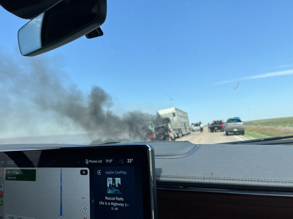 Vi havde nu endnu et lang stykke vej til dagens anden oplevelse. Undervejs så vi der var noget der brændte ude på en mark. Det viste sig, at vi kom forbi det sted hvor det brændte. Det var en lastbil der var gået i brand og derefter var der gået ild i marken. Det så heldigvis ikke ud til nogen var kommet til skade og dyrene i lastbilen var blevet lukket ud. Men branden så bestemt ikke ud til at være under kontrol. Vi fik lov til at køre forbi (hvilket også var heldig for omvejen havde været meget stor).