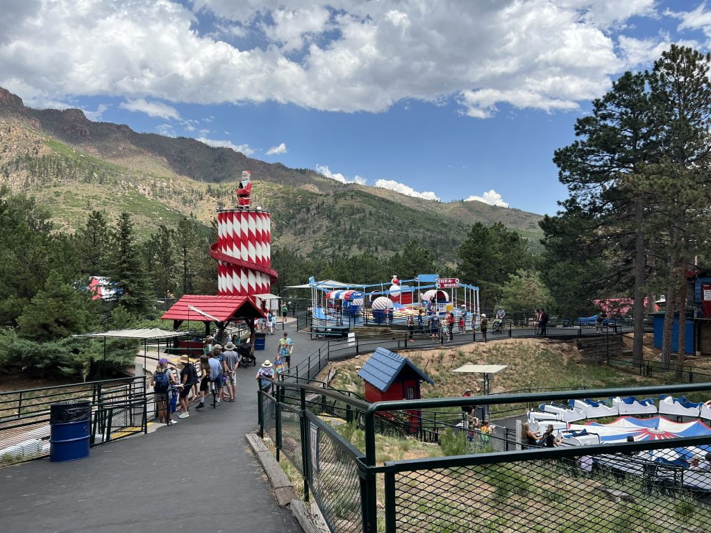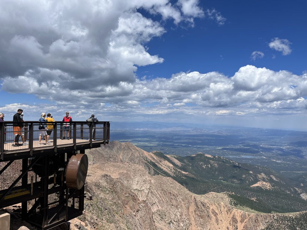 Vi havde på forhånd bestilt adgang til bjerget, da der i sommer perioden er så mange der vil besøge Pikes Peak er der ikke er plads til dem alle. Vi havde betalt to dollars for reservationen. Derudover skulle vi betale 52 dollars for at vi alle kunne komme ind. Der var en mindre kø ved indgangen, men den fik vi hurtigt klaret. Der blev endda tid til en hurtig tur over til “tisseskuet” for Villads. Winnie var ikke helt tilfreds med at vi tog den chance, men det virkede til der var en del andre der blev inspireret af Villads tur på toilettet, for derefter væltede det ud med mennesker for de mange ventede biler som skulle på toilettet.